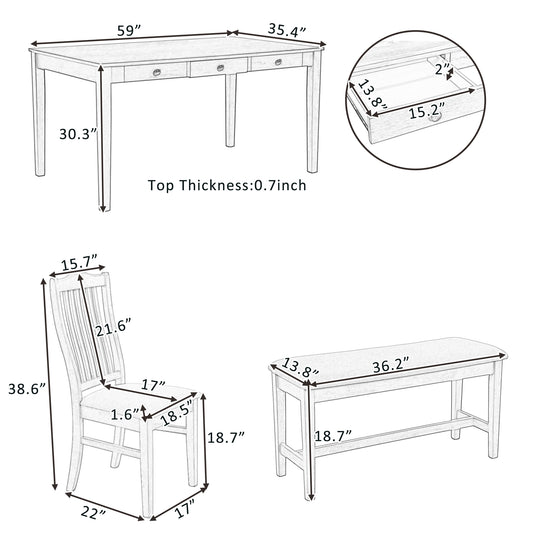 Mid-Century 6-Piece Wood Dining Table Set, Kitchen Table Set with Drawer, Upholstered Chairs and Bench, Butter Milk